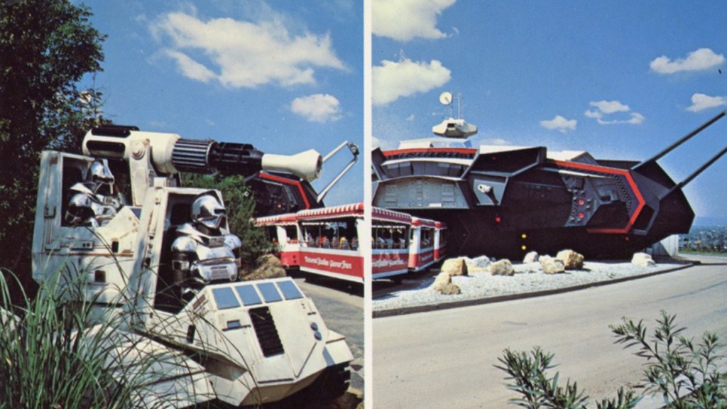 We start off in a 12 seat trolley as opposed to his two seater red Sun Beam. His TV show has the coolest opening credits of any. I sit and watch Don in my mirrors as I plow ahead into our first animation… The Evil Cylons. I catch quick peeks of him and his kids. They react to the loud colorful laser mayhem. They paid good money to see this.